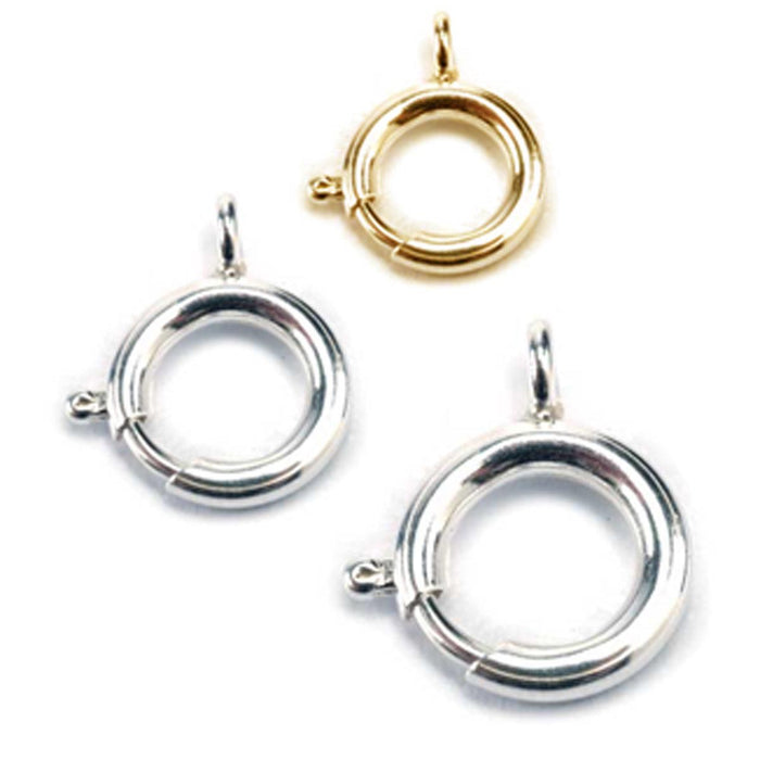 Sold by the Piece. Spring rings are the most popular type of clasp used for chains worn around the neck as they are secure and easy to use. Sterling Silver Spring ring clasps are round hollow tubes with a tiny coil spring inside and a jump ring attached for connecting to one end of a chain. A movable spring tensioned “bolt” has a lever attached. Use your fingernail to push the bolt back to open the spring ring. The bolt is held firmly closed by that same tiny internal spring inside the tubing. It takes 2 hands to open and close a spring ring. These Large Sterling Silver spring ring clasps have an open top jump ring on top, for easily attaching to one end of the chain. Often times the jump ring is simply twisted to a closed position when attaching, but that open jump ring is not secure. You cannot use the heat from a torch to solder the jump ring closed as the internal spring will be damaged by the heat. The proper way to close the ring is to laser weld or tack weld the jump ring.