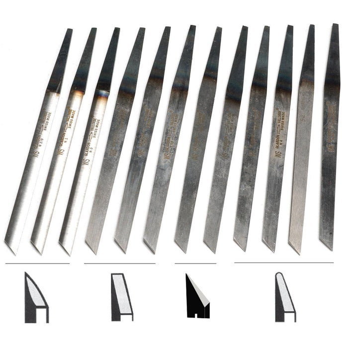 This set of Glardon-Vallorbe Swiss Made carbon steel gravers contains the most popular gravers recommended for use for doing stone setting work. These full size carbon steel gravers require fitting to handles and final finishing for use. Kit contains one each of Onglette 2/0, 0 & 1, Flat 37, 40 & 41, Knife 1 & 2 and Round 50, 51, 52 & 53.