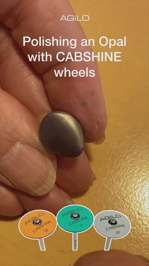 Die AGILO CABSHINE-XF ist eine extrafeine Diamantpolierscheibe mit Messerschneide, die Cabochons und edlen Edelsteinen den letzten Glanz verleiht – insbesondere in engen Bereichen und bei bereits in Ringe eingefassten Steinen. Sie wurde in der Schweiz für AGILO entwickelt und von Schweizer Steinschleifern und Juwelieren getestet. Sie ermöglicht es Goldschmieden, viele Steine bis zu einer Mohs-Körperhärte von ca. 9 selbst zu polieren.