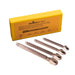 Das 4er-Set Bergeon 1842-B Stiftschraubstöcke mit Vierkantkopf enthält 4 verschiedene Stiftschraubstöcke mit einer Länge von 80 mm (3-1/8 Zoll), 100 mm (4 Zoll), 120 mm (4-3/4 Zoll) und 140 mm (5-1/2 Zoll), alle aus hochwertigem, vernickeltem Messing gefertigt. Jeder Schraubstock hat zwei Stahlfutter. Die Öffnungen reichen von 0 bis 5 mm. Die Vierkantköpfe liegen flach auf der Werkbank, sodass sie nicht herunterrollen. Wird in einer Aufbewahrungsbox aus Karton mit Schlitzen zur Aufnahme der einzelnen Stiftschraubstöcke geliefert.