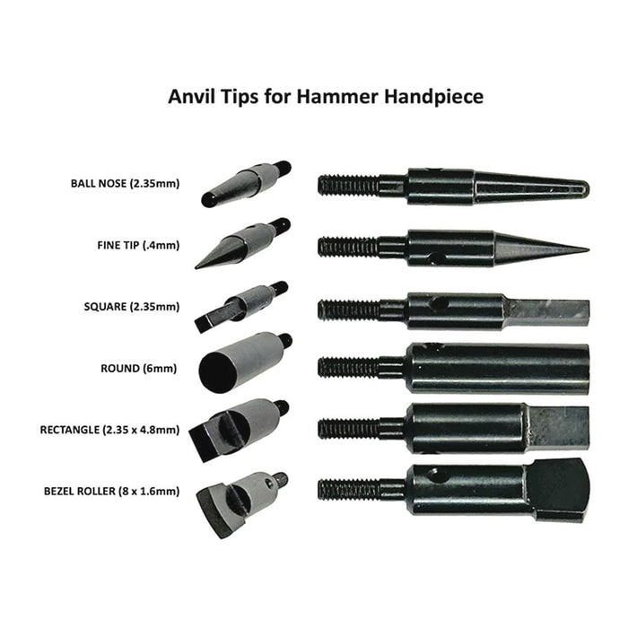 Ein Set mit 6 verschiedenen Ambossspitzen für das Eurotool-Hammerhandstück. Diese Spitzen passen auch auf die Foredom H.15 & H15D-Hammerhandstücke, die Badeco 217 & 222-Hammerhandstücke und die Technique-Hammerhandstücke. Ein echter Kauftipp!