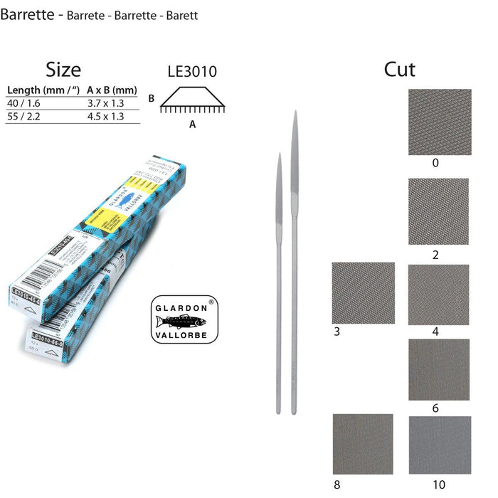 Las limas Glardon-Vallorbe Barrette Escapement fabricadas en Suiza tienen mangos cuadrados. Las longitudes de las limas de escape se miden desde la punta hasta el final del corte y las medidas no incluyen la espiga. Las limas de escape también se denominan limas Watchmakers.