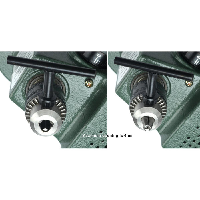Esta prensa taladradora en miniatura utiliza un mandril Jacobs ajustable que aceptará brocas desde 0,6 mm hasta 6,0 mm de diámetro. El recorrido máximo del mandril Jacobs es de 1" (25,4 mm), mientras que la distancia entre la plataforma de trabajo y el mandril se puede ajustar desde el contacto con la plataforma de trabajo hasta 8" (200 mm). Utilice un tornillo de banco de prensa, como el tornillo de banco Foredom Drill Press (nuestro número