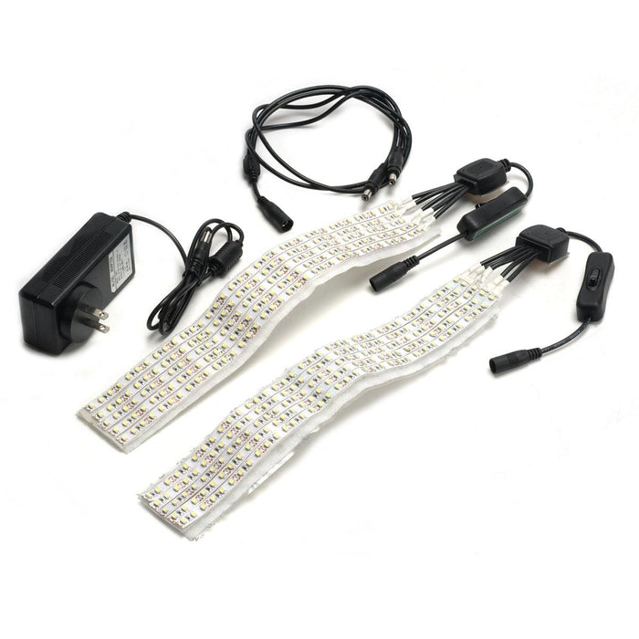 Cada tira tiene su propio interruptor de encendido/apagado y un accesorio de velcro de 2 piezas. El interruptor también tiene una parte posterior adhesiva para el montaje. Los interruptores de encendido/apagado se conectan a un cable de doble enchufe de 26" de largo que luego se conecta a la fuente de alimentación de doble voltaje 100-240AC que requieren las luces LED.