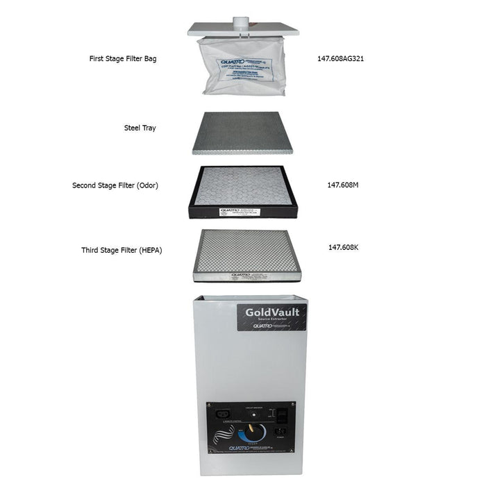 El Quatro Gold Vault utiliza un proceso de filtrado de tres etapas para capturar partículas. La primera etapa es un filtro de bolsa convencional de fácil acceso para capturar partículas más grandes. La segunda etapa es un filtro de olor a carbón F229 para capturar vapores y olores de humo que los filtros de partículas no pueden hacer. La tercera etapa es un filtro con clasificación HEPA F230 para capturar las partículas más finas de polvo y escombros.