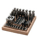 El juego de herramientas Value Line Jumbo Dapping incluye 36 punzones de dapping de 3,5 mm a 24,5 mm, un dado de dapping de cubo de 2-1/2" con 21 depresiones de 4,5 mm a 45 mm, un bloque de formación de acero con semirredondo, plano y derecho -ranuras angulares, un bloque de doblado semicircular con 10 ranuras, de 5 mm a 22 mm de ancho, un troquel plano de 5" x 2-1/2" x 1" con 27 depresiones que van desde 2 mm a 24 mm de diámetro, todas montado sobre un soporte de madera.