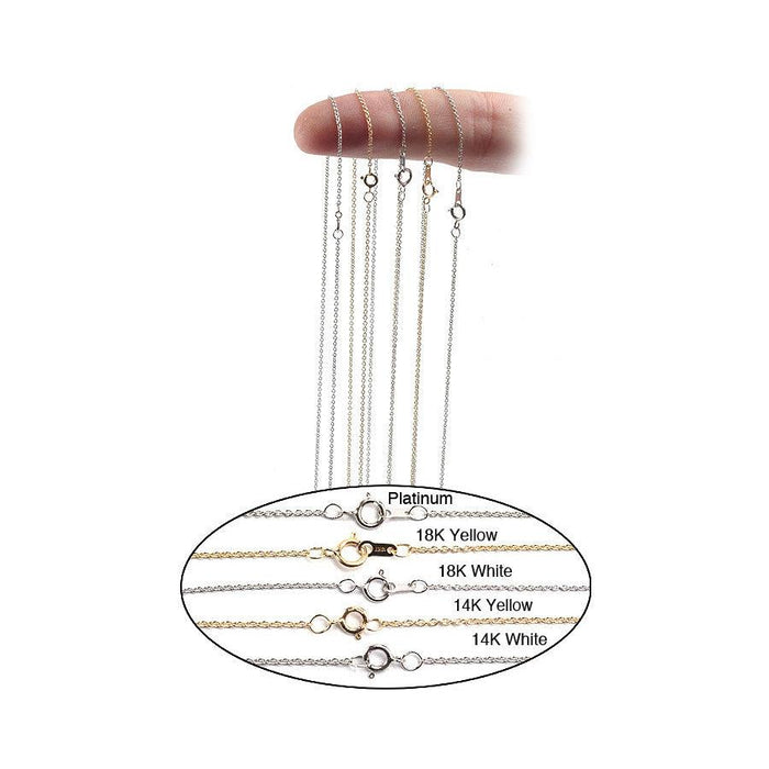 American made 1.15mm cable chain finished with spring ring clasps and quality tags. Choose from 14K yellow, 14K white, 18K yellow, 18K white & Platinum in either 16", 18" or 20" lengths.