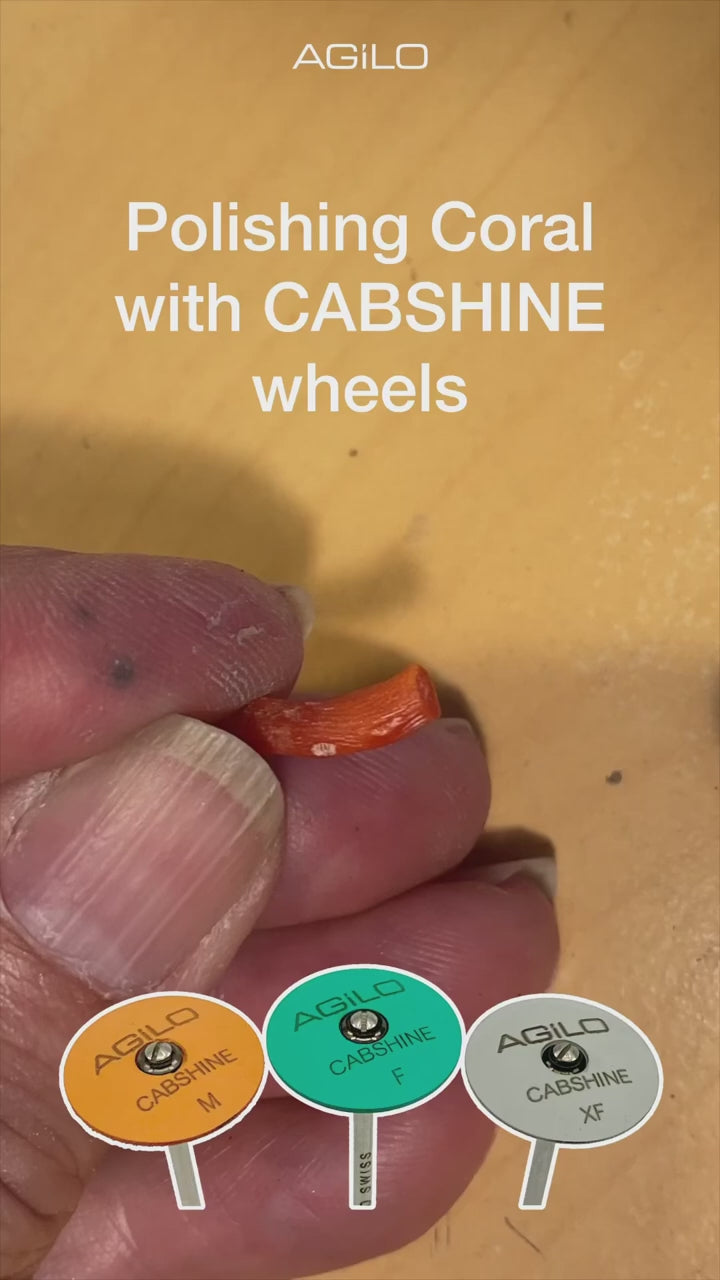The CABSHINE-F from AGILO is a diamond polishing wheel engineered to remove scratches on stones. The CABSHINE-F fine grit square edge wheel is 7/8" diameter by 1/8" thick and is mounted on a 3/32" shank. It can be used alone but it is meant to be used in a 3-part polishing process that includes the CABSHINE-M medium grit (110.111M) and the CABSHINE-XF extra-fine grit (110.104) wheels.