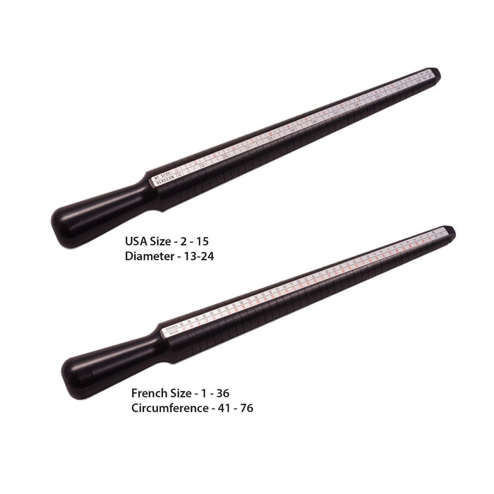 The Bergeon Black Delrin Ring Stick, Bergeon number 5235-PN, is regarded as the best quality and most precise measuring ring stick on the market. The Delrin material will not scratch metal rings. The total length including the handle is 250 mm (9-7/8"). One side has graduations in USA sizes 1-15 and graduations in Diameter from 13 mm to 24 mm. The other side has French sizes from 1 to 36 with Circumference marked from 41 mm to 76 mm. Made in Switzerland.