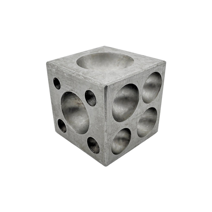 This 2" (50mm) square steel dapping die has 21 different spherical depressions from smallest approx. 3.5mm to largest approx. 35mm in diameter. They are machined, hardened steel. Made in Europe, this is NOT one of the cheaper versions made in India or Pakistan.