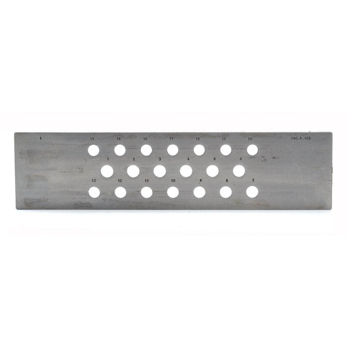This large draw plate has 20 holes with 14mm the largest and 12mm being the smallest. It measures 15" long by 5" wide and ½" thick. Weighs 5 lbs