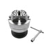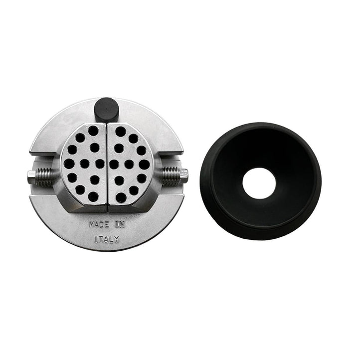 This OMO mini engraving block is made in Italy and compares to the GRS micro block in size, measuring 3-1/8" (80mm) in diameter by 3-1/2" (89mm) in height not including the base. When on the base the mini engraving block measures 4" (102mm). Perfect for microscope work. Jaws open to 1-1/2" (38mm). Weighs 5 lbs (2.3Kg). Base is made of aluminum. Includes a key for opening and closing jaws. Hole diameters are 4mm. A ring fixture attachment set is available separately.