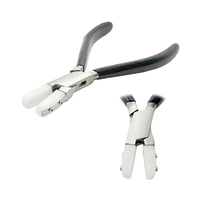 These 5-3/4" flat nose nylon jaw pliers (part no. 146.360) are a durable and economical choice for jewelers and metalsmiths. Made in Pakistan from stainless steel, they feature replaceable nylon jaws that protect delicate surfaces while shaping, straightening, or holding metal components.