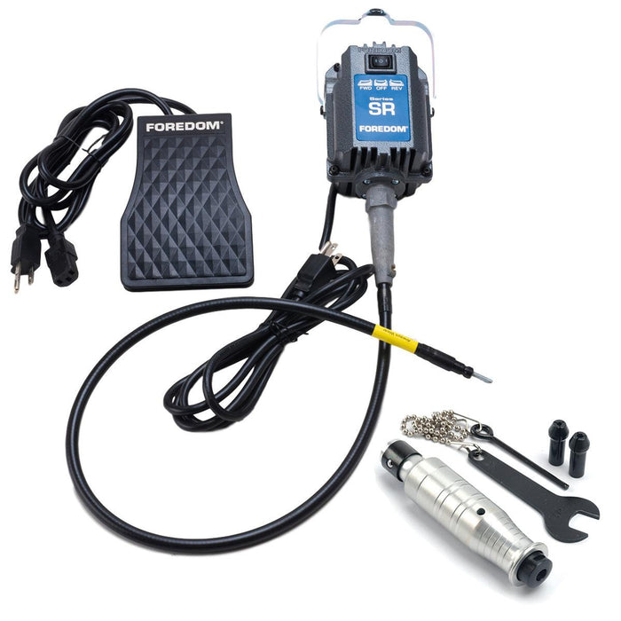 Hang-up flex shaft system with a 1/6 HP reversible SR motor, variable-speed foot control and your choice of professional handpiece for jewelry and metal finishing work. Smooth, foot-controlled torque lets you feel each cut, grind and polish with confidence.