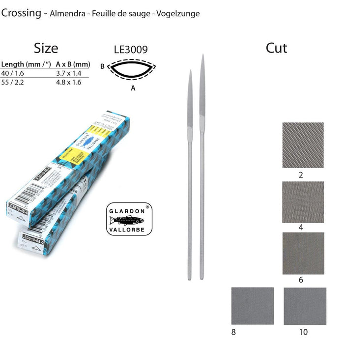 Swiss made Glardon-Vallorbe Crossing Escapement files have square handles. Escapement file lengths are measured from tip to the end of the cut and measurements do not include the tang. Escapement files are also called Watchmakers files.