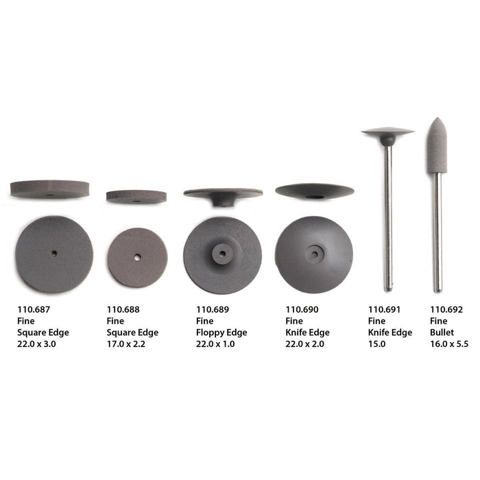 Fox-Kyle diamond polishers use pulverized super fine diamonds bonded with synthetic rubber to give you an extremely effective, long lasting tool for scratch removal, surface prep and final polishing. Made in Germany.