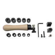 This ring setter's clamp set features three head configurations to help you hold rings securely while setting stones in vertical, horizontal or angled positions. This set includes a handle (5-3/4"L) and 10 nylon split-collet inserts that accommodate U.S. ring sizes 2 to 14 (13-23mm ID). A short Allen-head bolt is also included that allows you to replace the thumb-wheel on the vertical positioning head, giving you improved access to rings when you need it