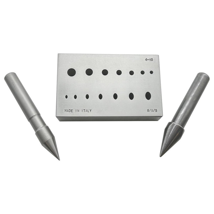 Bezel blocks are a handy tool for making quick and easy bezel settings for faceted stones and some cabochons. Our Italian-made bezel blocks are made of specially hardened steel and come with a matched punch. Since punches can break under normal use, replacement punches are available for our most popular blocks.